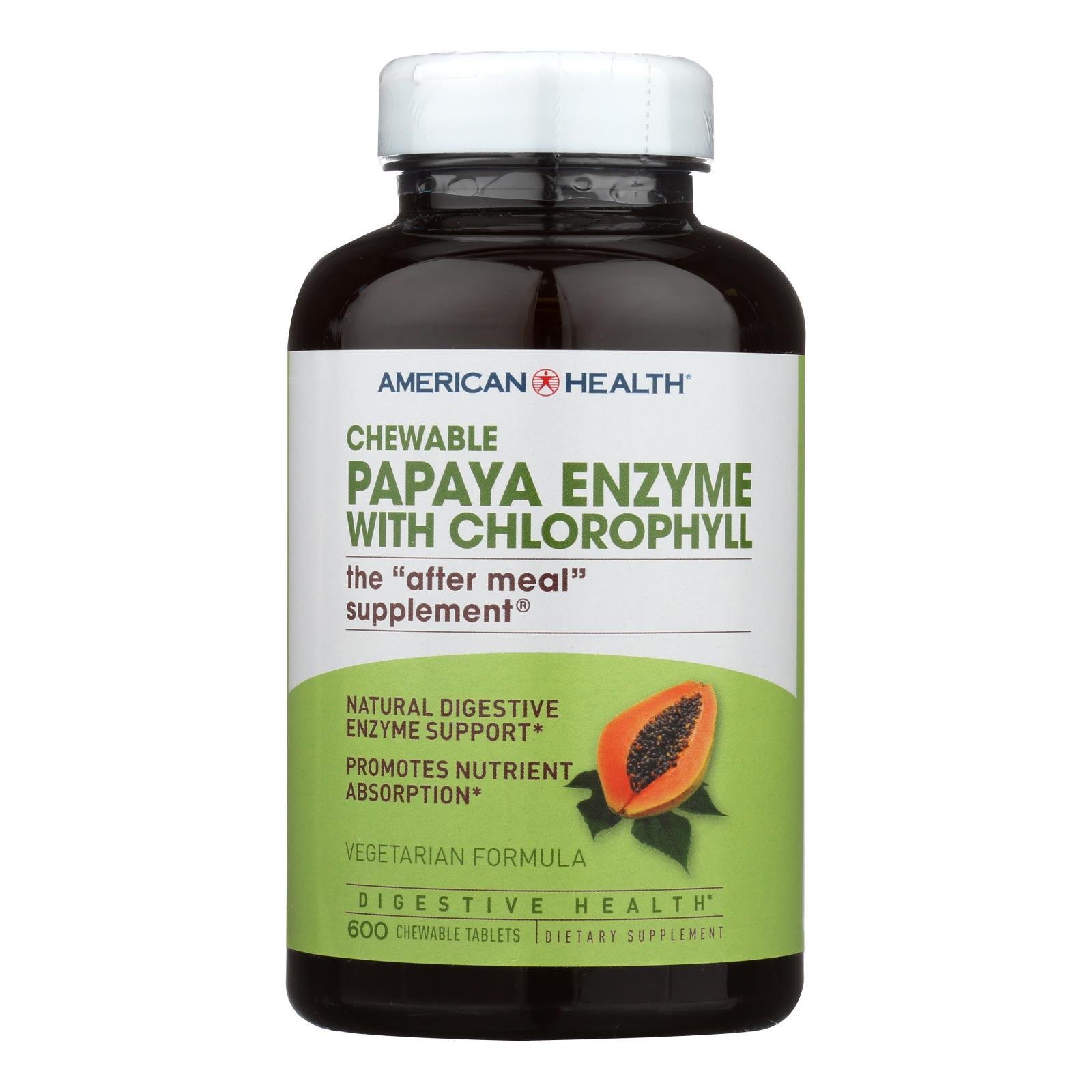 American health papaya enzyme with chlorophyll is our dietary supplement that uses a gluten-free formula free of artificial flavors and preservatives. Our vegan friendly papaya enzyme with chlorophyll is the perfect after-meal supplement to help support daily digestive health. We combine the finest quality of freshly ripened papaya fruit with papain, amylase and protease enzymes to aid in the digestion of proteins and carbohydrates. There are no eggs or dairy products in our chewable tablets and we don't use yeast. Included is one bottle of 600 american health papaya enzyme with chlorophyll chewable tablets. See nutrition facts panel for allergens. Good health does not need to be complicated. We understand the complex needs of a healthy lifestyle and develop supplements which work synergistically with your natural physiology to help promote proper balance and wellness.