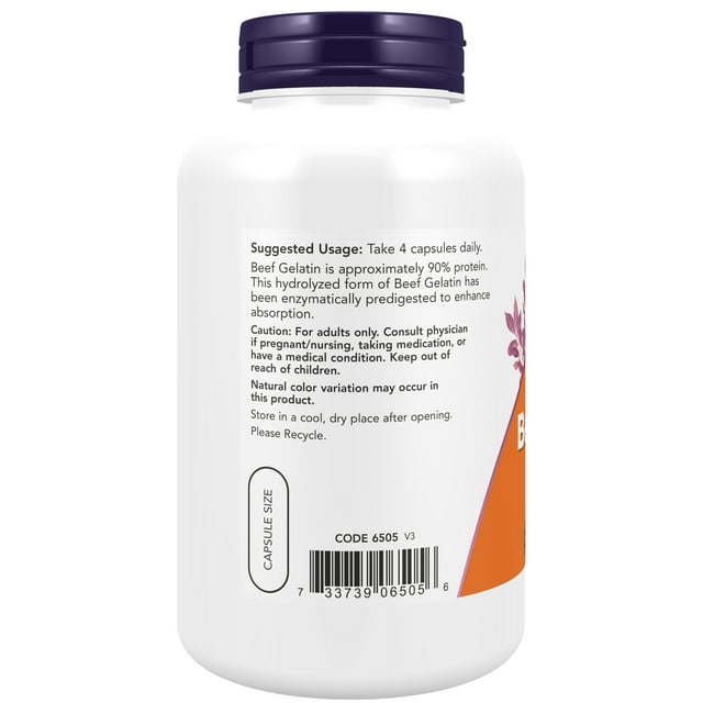Take 4 capsules daily. Beef Gelatin is approximately 90% protein. This hydrolyzed form of Beef Gelatin has been enzymatically predigested to enhance absorption.