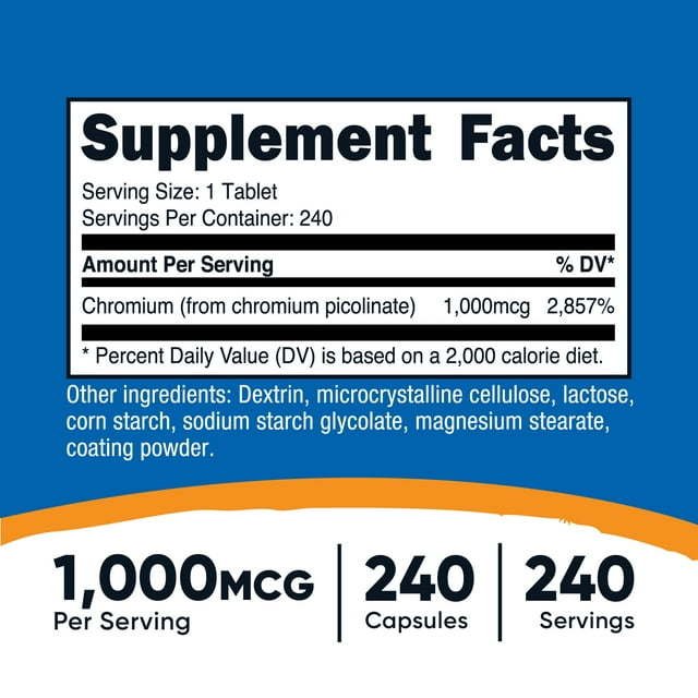 Nutricost Chromium Picolinate tablets contain 1,000mcg of chromium in each tablet. Each bottle contains 240 tablets. They are small, easy-to-swallow tablets. This product is non-gmo, gluten free, and made in a GMP compliant, FDA registered facility.