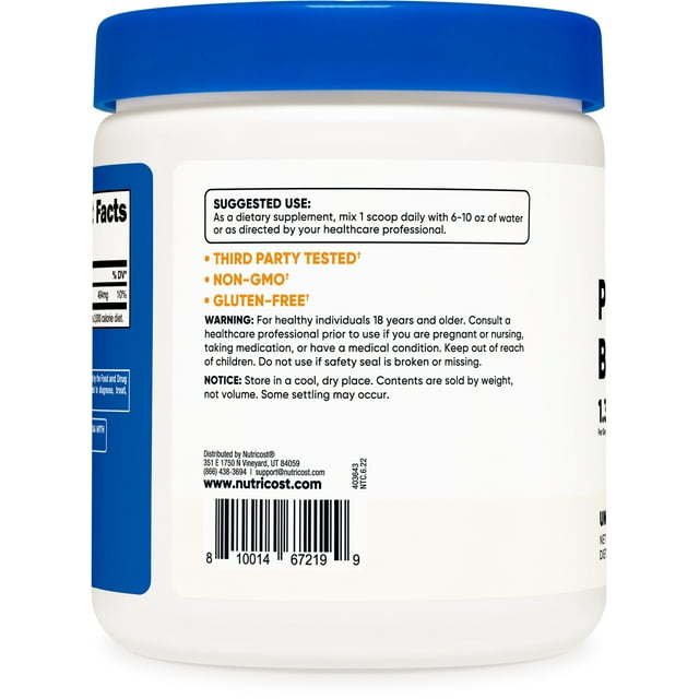 Nutricost Potassium Bicarbonate powder contains servings. Each serving contains 1.3G of Potassium Bicarbonate per serving. It is non-GMO and gluten free. Nutricost, located and headquartered in the USA, only uses the best ingredients to ensure maximum quality and to help you feel your best! By keeping our supplement recipes simple and clean, you get the best experience possible with Nutricost. Our supplements are manufactured in a GMP-compliant and FDA-registered facility; and each batch of every product is tested by independent, ISO-accredited laboratories. These statements have not been evaluated by the Food and Drug Administration. This product is not intended to diagnose, treat, cure, or prevent any disease.