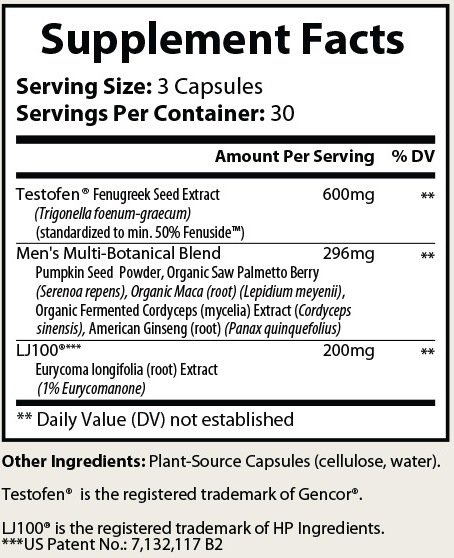 Testofen ® was also added to Pure Testosterone. Testofen ® is a patented specialized saponin glycoside extract from Fenugreek(Trigonella foenum-graecum seed) by Gencor™. Testofen® has been shown to significantly increase free testosterone in a 12 week trial at 600mg dose. This may be due to the inhibition of aromatase and 5α reductase, reducing the conversion of testosterone to estrogen and dihydrotestosterone, leaving more total testosterone. Free testosterone is the most important testosterone because it is the only usable testosterone in the body.