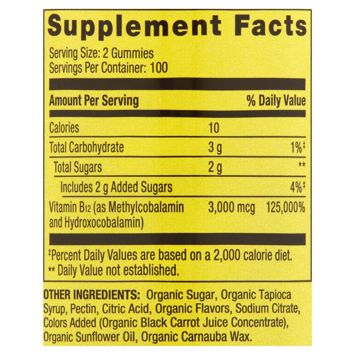 Organic and Non-GMO; Spring Valley Extra Strength B12 Gummies; 3; 000 mcg; 200 Ct have been specifically formulated with Methylcobalamin to support energy metabolism. Methylcobalamin is an active form of Vitamin B12 that supports energy metabolism and plays an important role in the formation of red blood cells.